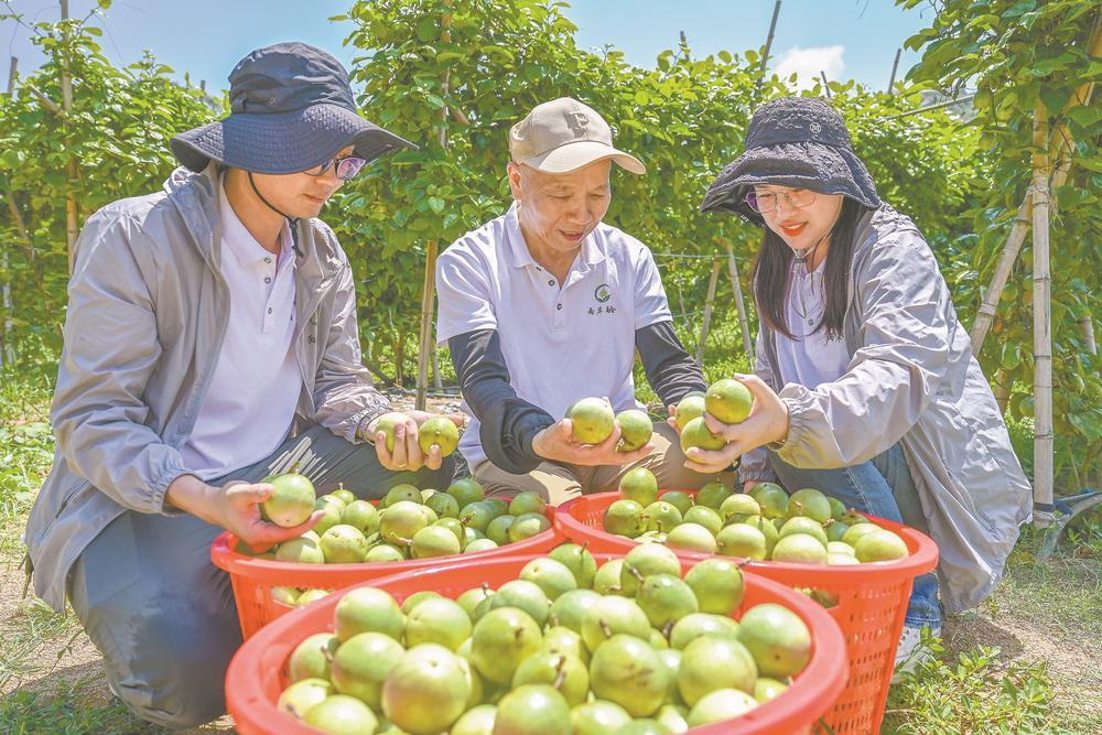 台农苏文桢(中)和种植户们在分拣黄金百香果。 本报通讯员 江信恒 摄 9月的平潭,暑气渐消,海风里多了几分让人垂涎的甜润,那是台湾黄金百香果成熟的气息。记者走进平潭君山片区大坪村的果园,藤蔓顺着支架蜿蜒,一颗颗金黄的果实藏在绿叶间。 台农刘任兴俯身摘下一颗,指尖刚撕开薄脆的果皮,晶莹的汁水便顺着指缝滴落,酸甜交织的果香瞬间在空气中弥漫。“你尝尝,今年我们一共种植了50亩百香果,品质非常好,甜度比去年还高!”刘任兴把刚摘的百香果递给记者。 三年前刘任兴带着黄金百香果种苗登岛时,心里还有几分忐忑:平潭的水土能种出地道的台湾味道吗? 这份顾虑在当年试种后便烟消云散。“第一年亩产就接近3000斤,果子还没运出果园,就被抢购一空。”谈起当时的热闹场景,刘任兴开心地说,“平潭温暖湿润的气候和台湾南部很像,加上独特的沙质土壤,简直是百香果的‘宜居地’。” 好品质引来回头客,大坪村村民曾台斌就是其中一位。每年百香果采收季一到,他总会准时来园里采购。“这果子甜得地道,果肉又多又嫩,在外工作的家人总念叨这口,每次都让我多带点过去。”曾台斌一边说着,一边挑拣着果实。 在平潭,种下“黄金果”的不只大坪村。从2021年开始,台农苏文桢便带着多个台湾优质水果种苗在平潭苏平片区的友谊村试种。通过对不同种苗的生长表现对比,选出了在收成与品质上都格外拔尖的“钦蜜9号”台湾黄金百香果。 为了让品种更适配平潭的环境,苏文桢还试着将台湾“钦蜜9号”与本地品种嫁接培育出全新品种“闽台1号”。“新品种不光品相好、甜度高,还特别耐得住平潭的高温和大风。”苏文桢介绍,去年首次实现规模化种植,采收期就长达7个月,亩产约4000斤,亩产值突破4万元。 如今越来越多平潭人投身台湾黄金百香果的种植。大坪村的李元钊就是最早“尝鲜”的农户之一。在他30多亩的果园里,记者看到藤蔓下挂满了沉甸甸的“金疙瘩”。分拣果实时,他算起了收益账:“种百香果比种传统作物划算多了,今年预估一亩能赚上万元,翻了好几倍!明年我打算扩种。” 林海燕也是种植“黄金果”队伍中的一员。看好黄金百香果的市场前景,她便一头扎进果园,从翻土整畦、搭架引藤,到施肥浇水、防治病虫害,一步步跟着学、慢慢练,如今已经熟练掌握了全套种植技术。 “今年我和苏文桢合作,在友谊村和山利村一口气种了200余亩台湾黄金百香果,同时采购了AI智能分拣等设备,提高分拣效率和果实分级精度,让每颗百香果都能以更好的品相走向市场。”林海燕说。 台湾黄金百香果的种植面积在平潭不断扩大,君山片区大坪村、苏平片区友谊村、海坛片区上楼村,以及金井片区的山利村、东崑村和大厝基村等都有农户种植,种植面积从十几亩至百余亩不等,平均亩产2000斤至3000斤。 与此同时,不少种植团队也开始琢磨起拓展产业链、提高百香果附加值的新路子。“我们计划再投入300万元,用于购置加工生产设备,把百香果加工成果酱、果汁、果脯,既能卖鲜果,也能变成耐储存的特色产品,让更多村民受益。”苏文桢说。 |