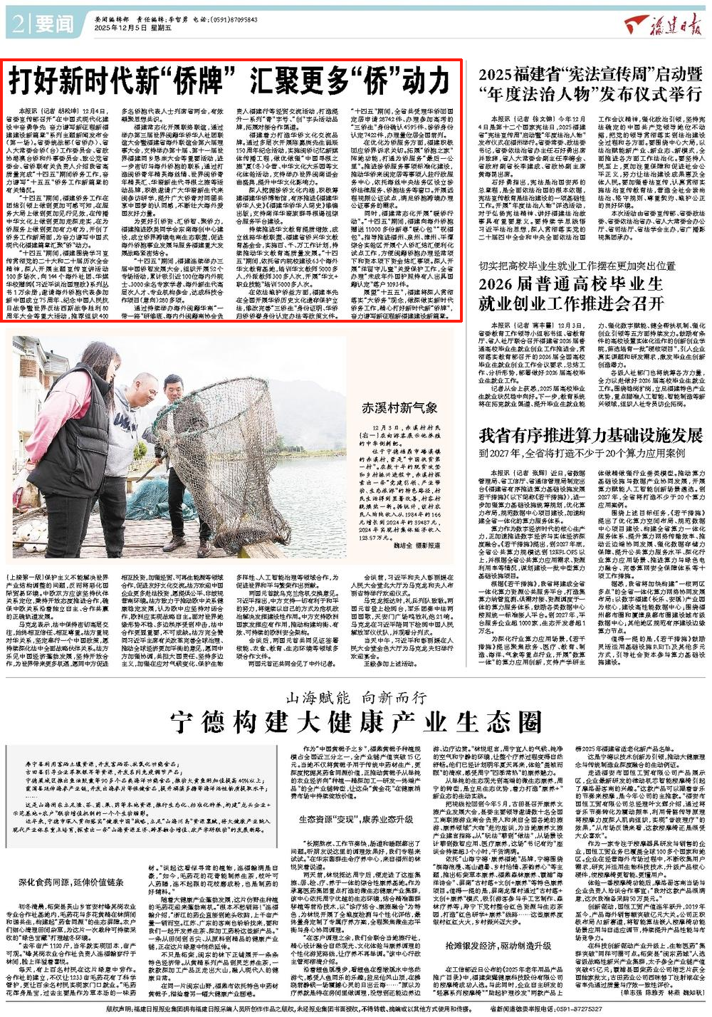 《福建日报》2025年12月5日第02版 东南网12月5日讯(福建日报记者 胡松坤)12月4日,省委宣传部召开“在中国式现代化建设中奋勇争先 奋力谱写新征程新福建建设新篇章”系列主题新闻发布会(第一场)。省委统战部(省侨办)、省人大常委会侨(台)工作委员会、省政协港澳台侨和外事委员会、致公党省委会、省侨联有关负责人介绍我省高质量完成“十四五”期间侨务工作,奋力谱写“十五五”侨务工作新篇章的有关情况。 “十四五”期间,福建侨务工作在团结引领上做到更加可感可知,在服务大局上做到更加见行见效,在传播中华文化上做到更加走深走实,在为侨服务上做到更加有力有为,开创了侨务工作新局面,为奋力谱写中国式现代化福建篇章汇聚“侨”动力。 “十四五”期间,福建围绕学习宣传贯彻党的二十大和二十届历次全会精神,深入开展主题宣传宣讲活动100多场次,向144个海外社团、华媒华校赠阅《习近平谈治国理政》系列丛书1万余册;邀请海外侨胞代表参加新中国成立75周年、纪念中国人民抗日战争暨世界反法西斯战争胜利80周年大会等重大活动,推荐组织400多名侨胞代表人士列席省两会,有效凝聚思想共识。 福建常态化开展联络联谊,通过举办第三届世界闽籍华侨华人社团联谊大会暨福建省海外联谊会第六届理事大会,支持举办第十届、第十一届世界福建同乡恳亲大会等重要活动,进一步密切与海外侨胞的联系;通过打造闽侨青年精英海丝情、世界闽侨青年精英汇、华裔新生代寻根之旅等活动品牌,积极邀请广大华裔新生代来闽参访研学,提升广大侨青对同圆共享中国梦的认同感,不断壮大海外爱国友好力量。 为更好引侨资、汇侨智、聚侨力,福建推进欧美同学会东南海创中心建设,成立侨界跨境电商生态联盟,促进海外侨胞事业发展与服务福建重大发展战略紧密结合。 “十四五”期间,福建连续举办三届中国侨智发展大会,组织开展52个专场活动,累计吸引近100位海内外院士、3000余名专家学者、海外新生代高层次人才、专业机构参会,达成科技合作项目(意向)280多项。 通过持续举办海外闽籍华商“一带一路”研修班、海内外闽籍商协会负责人福建行等经贸交流活动,打造提升一系列“青”字号、“创”字头活动品牌,拓展对接合作渠道。 福建着力打造华侨文化交流品牌。通过多层次开展陈嘉庚先生诞辰150周年纪念活动,实施闽侨记忆新媒体传播工程,做优做强“中国寻根之旅”夏(冬)令营、中华文化大乐园等文化体验活动,支持举办世界闽南语金曲盛典,提升中华文化影响力。 深入挖掘涉侨文化内涵,积极筹建福建华侨博物馆,有序推进《福建华侨华人史》《福建华侨华人简史》修编出版;支持南洋华裔族群寻根谒祖综合服务平台建设。 持续推进华文教育提质增效,成立丝路华教联盟、福建省侨兴华文教育基金会,实施百、千、万工作计划,持续推动华文教育高质量发展。“十四五”期间,依托省内院校建设63个海外华文教育基地,培训华文教师5000多人,外派教师300多人次,开展“华文+职业技能”培训5000多人次。 在依法维护侨益方面,福建率先在全国开展华侨历史文化遗存保护立法,修改完善“三侨生”身份证明、华侨归侨侨眷身份认定办法等政策文件。“十四五”期间,全省共受理华侨回国定居申请28742件、办理参加高考的“三侨生”身份确认4595件、涉侨身份认定7422件,办理量位居全国前列。 在优化为侨服务方面,福建积极回应侨界诉求关切。拓展“侨胞之家”阵地功能,打通为侨服务“最后一公里”。推进涉侨服务事项标准化建设,推动华侨来闽定居等事项入驻行政服务中心,依托海丝中央法务区设立涉侨法律服务、侨胞法务等窗口。开展远程视频公证试点,满足侨胞跨境办理公证事务的需求。 同时,福建常态化开展“暖侨行动”。“十四五”期间,福建向海外侨胞赠送11000多份新春“暖心包”“祝福包”。指导推进福州、泉州、漳州、平潭综合实验区开展个人侨汇结汇便利化试点工作,方便闽籍侨胞办理经常项下和资本项下资金结汇事项。深入开展“洋留守儿童”关爱保护工作,全省办理“未成年外国护照持有人出具国籍认定”落户1093件。 展望“十五五”,福建将深入贯彻落实“大侨务”观念,做深做实新时代侨务工作,精心打好新时代新“侨牌”,奋力谱写新征程新福建建设新篇章。 |