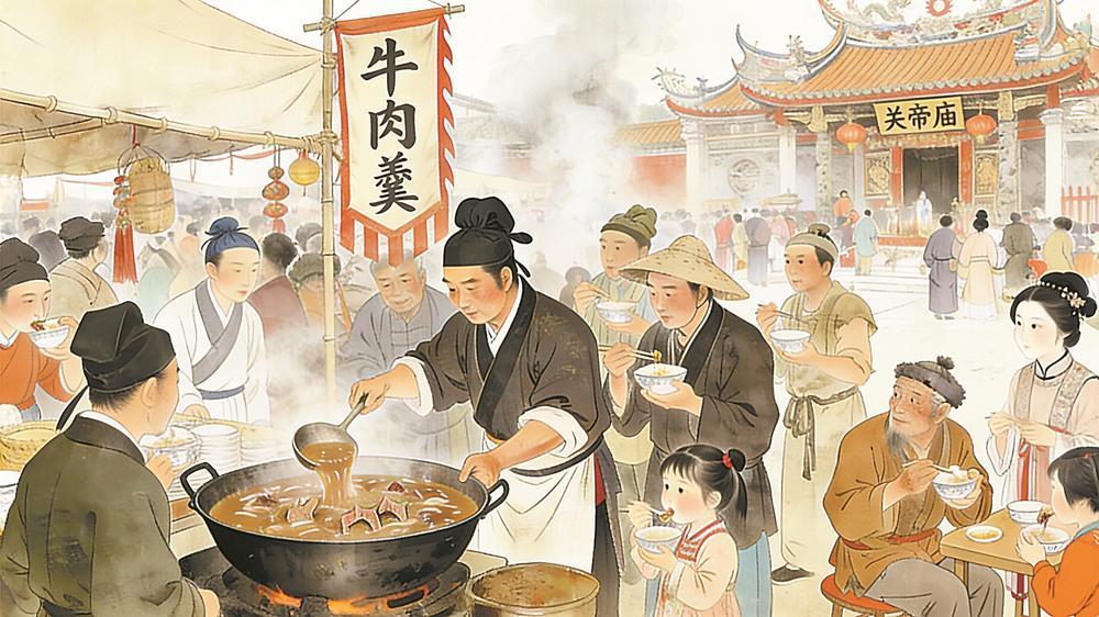 明朝庙会吃牛肉。