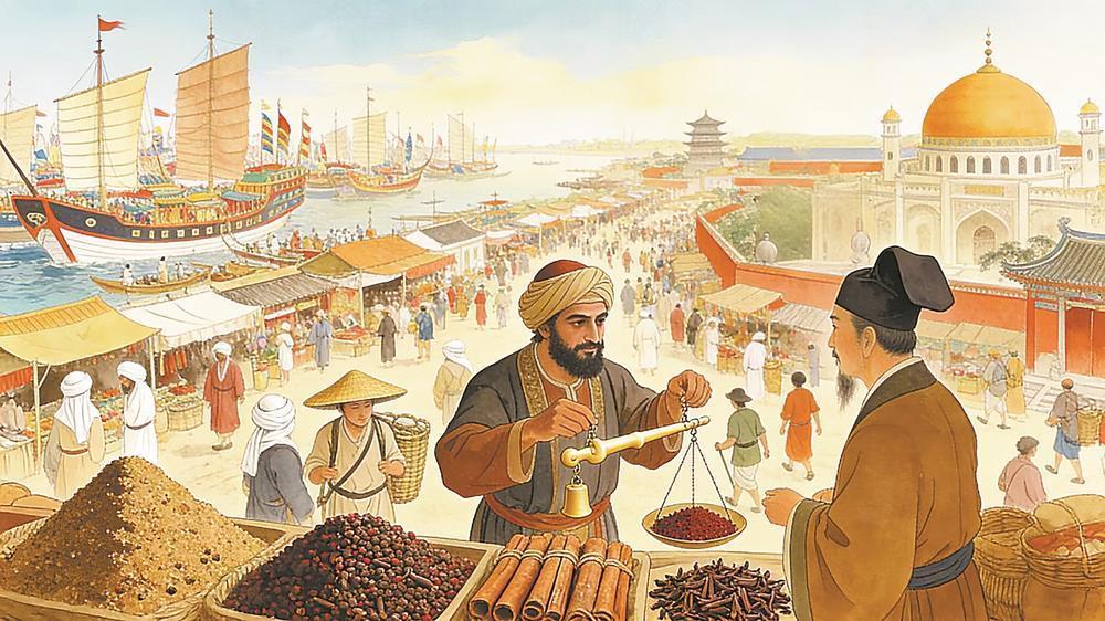 宋朝蕃市卖胡椒。 东南网12月16日报道(福建日报记者 汪洁) 11月28日,第二届中国(泉州)丝路小吃嘉年华在泉州开幕,清晨的东海之滨已是香气四溢。来自海丝沿线各国以及福建本土的小吃摊位在风中展开旗帜,手抓饼、椰浆饭、牛肉羹、沙茶面等各色美食在古城交汇。游客穿梭其间,争相品尝来自各国的特色美食;摊主一边忙碌,一边用夹杂闽南语的普通话介绍“家乡味”。 小吃节的热闹景象,让人仿佛回到了800年前的泉州港——那个被马可·波罗称为“世界最大贸易港”的刺桐港。宋元时期“蕃舶云集、语言纷杂”“市井之中百货并陈”的场景,似乎就在眼前。 在中国广袤的版图上,福建因其特殊的地理位置和漫长的对外交流历史,成为最早拥抱外来味道的地方之一。从番薯、玉米等作物的入闽典故,到阿拉伯商旅在宋元泉州留下的清真饮食痕迹,再到近代从南洋而来的沙茶、咖喱,福建人的餐桌上始终飘散着跨文化的气息。 频频“接收”海外新作物 在福州乌山脚下,有一座先薯亭。亭中石碑刻着:“长乐陈振龙载薯归来,惠及万世。” 这座亭子,藏着番薯传入福建的传奇故事,更是百姓对这种外来作物成为“救命粮”的纪念。 史书记载,番薯原产美洲,约于16世纪下半叶通过菲律宾传入中国,而福建是其最早的登陆地。关于引入者,学界普遍引用《番薯序》《番薯赞》等文献,认为其由福建长乐人陈振龙、陈经纶父子从吕宋(今菲律宾)带回。陈振龙当时旅居菲律宾,见当地百姓以番薯为粮,且番薯耐旱高产,不顾当地西班牙殖民政府不准带朱薯出境的禁令,将薯藤绞于货船锚绳中,藏匿于船中,经七昼夜航行,终于将薯种带回福州。 明万历年间,福建巡抚金学曾在长乐、漳州一带试种并请示朝廷推广,最终形成大规模种植。番薯的适应力超乎想象,沙地能种、山坡能种、旱地能种。从福建起,番薯一路北上,很快覆盖长江以北地区,成为“半年之粮”、荒年作物的代表。清代文献曾统计,北方不少县份的番薯产量占粮食总产的三成以上,在灾荒季节“赖薯以全生”。 “作为海上丝绸之路的核心区,福建自宋元以来始终扮演着中国与海外贸易的前沿角色。潮水带来商船,也带来新的物种。”泉州申创世界美食之都专家顾问、华侨大学旅游学院教授汪京强介绍道,自宋代起,福建便频频“接收”来自海外的粮食与经济作物。其中,宋代从越南古国占城引入的占城稻,以耐旱、耐瘠薄、早熟、产量稳定的特性让福建农业摆脱了“望天收”的局面;16世纪传入福建的玉米,明代称“御麦”“番麦”,进入福建后迅速北传,遍及长江流域,最终成为北方山区重要粮食来源;花生在明清文献中常被称“番豆”,《福建通志》《永春县志》等均记载其在闽地种植广泛,至清代,花生油已成为福建沿海家庭的重要食用油来源,甚至成为对外贸易的商品之一…… 除粮食作物外,清代至近代经海路传入福建的物产更为多样,包括莲雾、释迦、芒果、人心果、番姜、番椒甚至番鸭、番匏等。其中张燮《东西洋考》列举的输入物品超过百种,而《清代琉球册封录》统计福建与琉球贸易输入品种达53种之多,呈现出海丝贸易下的物产繁华。 “今天我们认为产自中国的许多食材,事实上都是‘漂洋过海’来的。”汪京强说,这些外来引进物产在进入福建后,很快融入当地,不再带有“番”“洋”的标签,成为本土的一部分。“福建人善于改造,也乐于吸收。只要能在本地生长、能在厨房里找到角色,它就成为‘闽味’。” 从“不食牛”到“满城牛肉香” 在泉州鲤城区涂门街,有一座我国现存最古老的伊斯兰教寺——清净寺。附近有一家好成财牛排馆,是不少食客的“心头好”。店里的牛排是招牌菜,牛排已经被炖煮得牛肉与骨头几近分离,一口咬下去,肉香中夹杂着中草药味和咖喱香气,在口中四溢开来,令人回味无穷。 好成财在牛排制作工艺上倾注了三代人的心血,从100多年前下南洋的祖辈返乡开店,到如今涂门街上人气高涨的老字号,一根牛排融合了西式和本土两种烹饪方式的精髓,在百年传承中形成泉州特色的古早味。“从我爷爷到我父亲再交到我手里,都和牛肉打了一辈子的交道了。”好成财牛排馆第三代传人、泉州小吃制作技艺(牛肉食品)非遗传承人黄成财说。 如今,经营牛肉的餐馆在泉州的大街小巷随处可见。店里提供包括牛肉羹、牛排、牛杂汤、牛肉粉等在内的各式牛肉小吃。这种牛肉饮食文化,要追溯到唐代。 历史文献显示,自唐代起,阿拉伯与波斯商人便不断通过海上丝绸之路抵达泉州。《诸蕃志》《宋史》多有记载,宋元时期的泉州更是被誉为“东方第一大港”。随商旅同行的,是他们的生活习惯与饮食偏好。“在伊斯兰饮食文化中,牛是重要的肉类来源。而在传统农耕社会,牛作为重要生产工具,食用牛肉被视为禁忌。穆斯林‘不可一日无牛’的饮食习惯,逐渐冲击本地观念,泉州成为全国较早接受牛肉饮食的城市之一。”资深级注册中国烹饪大师、泉州酒店行政总厨史李生说。 随着外来商旅在泉州形成稳定社群,清净寺周边的街区曾出现专门面向外来商人的“蕃坊”,其中最受海客欢迎的食物便是以牛肉为主的热食。史籍虽未记录具体菜式,但考古与文书中均见到关于“蕃食”“蕃膳”的指向性描述。 泉州本地居民逐渐从好奇转向接受。市井小贩开始学习外来商人处理牛肉的方