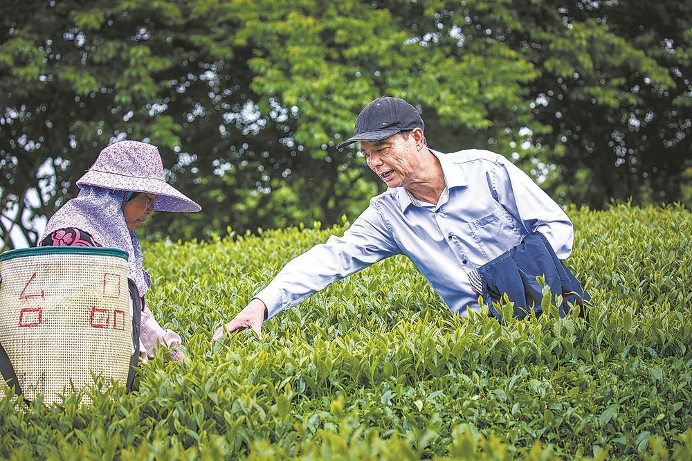 在漳平台创园,台商谢东庆(右)和茶农一起采摘茶叶。 (漳平融媒体中心供图)