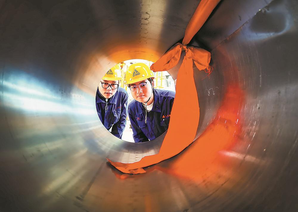 工人查看生产出的第一卷冷轧硅钢。 本报讯 (报业集团记者 萧镇平 苏益纯 通讯员 沈素鑫 文/图) 12月29日上午,国内首台套采用小六辊六机架(UCMW)酸连轧全智能控制系统的生产线在三宝集团建成投产。其生产的高端马口铁产品,将打破国内食品行业长期依赖进口优质金属包装材料的局面。 这条生产线是三宝集团冷轧硅钢项目的一期首条生产线,从动工到生产线顺利出卷,仅用时10个月,创造了同类单体项目建设速度与质量的新标杆。 三宝集团冷轧硅钢项目计划总投资80亿元,分三期建设。项目全部投产后,可年产256万吨高端硅钢与马口铁产品,预计新增产值200多亿元。 |