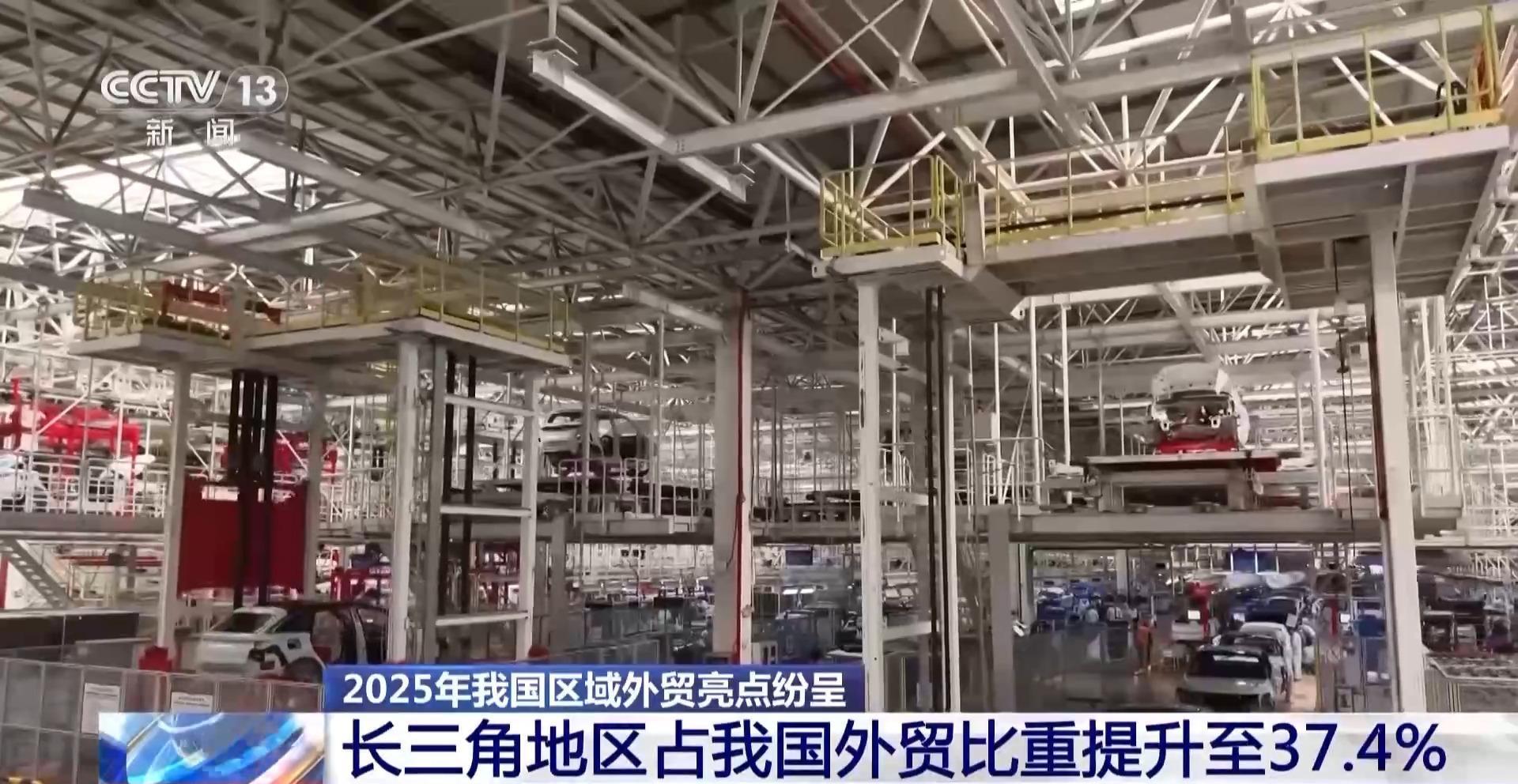 根据海关最新公布的外贸成绩单,2025年我国各区域外贸亮点纷呈,其中长三角地区以10.84万亿元的出口额占全国近四成,成为稳外贸的“压舱石”和“稳定器”。 长三角地区占我国外贸比重提升至37.4% 浙江这家新能源汽车企业里产线不停运转,平均每小时就有42辆新能源汽车驶下生产线,月产量超过2万辆。