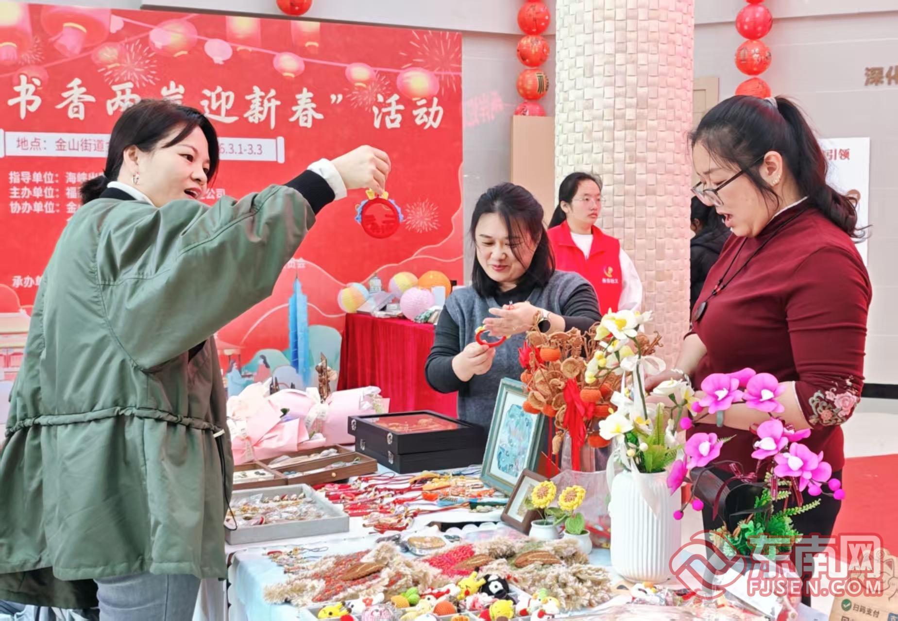 新春送“福” 东南网3月1日讯(本网记者 陈楠 文/图)1日,第五届“书香两岸迎新春”活动福州金山街道金洲社区启幕。以图书为媒、以文化为桥,通过特色活动打造沉浸式文化体验,为社区居民送上新春祝福。 图书及文创展销区成为首个亮点,精选的中华传统文化简体精品图书与闽版优质典籍整齐陈列,从传统民俗文化到非遗技艺传承,全方位展现中华文化的博大精深,具有地方特色的文创产品琳琅满目,每一件作品都承载着两岸的文化记忆,既展现了闽台地域特色,也彰显了文创产业的创新活力。活动现场还设置沉浸式阅读区,市民可静坐翻阅经典,同步启动的图书公益捐赠仪式上,主办方向金洲社区捐赠了一批海峡出版发行集团所属各出版社的图书,助力社区文化资源升级,推动传统文化在基层落地生根。 书法爱好者现场挥毫泼墨,一幅幅笔力遒劲的象征美好寓意书法陆续送到市民手中,楷、隶、行、草等多种字体各具韵味,传递着“迎春纳福”的美好愿景,在书法爱好者的悉心指导下,大人小孩纷纷提笔尝试,从握笔姿势到笔画勾勒,亲身感受汉字书法的独特美感。