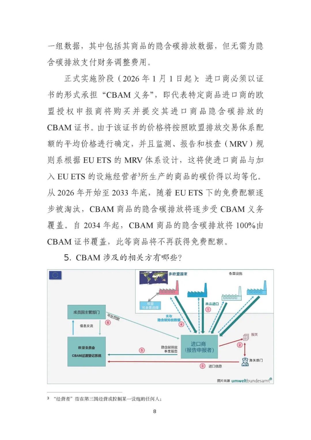 CBAM(碳边境调节机制,Carbon Border Adjustment Mechanism)是欧盟于2023年5月17日颁布的一项环境贸易政策。据欧盟官方称:碳边境调节机制(CBAM)旨在对进口商品施加与在欧盟(EU)内经营的设施同等的碳成本,是对欧盟排放交易体系(EU ETS)的补充,其目的是降低欧盟气候目标因生产转移到脱碳政策雄心较低的国家而受到破坏(即所谓的“碳泄漏”)的风险。 欧盟碳市场(EU ETS)是全球首个跨国碳排放交易系统,自2005年启动以来,通过配额交易机制推动行业减排。在欧盟排放交易体系下,欧盟生产商需要根据在生产过程中的每吨二氧化碳当量清缴排放配额。在CBAM实施前,为了降低碳泄漏的风险,相关行业(例如钢铁、水泥等高碳行业)在EU ETS下一直免费获得部分配额(即“免费配额”)。在CBAM的正式实施(过渡后)阶段,代表特定商品进口商的欧盟授权申报商将购买并提交其进口商品隐含碳排放的CBAM证书,其目的在于确保进口商品与欧盟本土商品承担同等的碳排放成本。 CBAM并不针对国家,而是针对在EU ETS范围内、碳泄漏风险最大的特定行业(例如钢铁和水泥)中,进口到欧盟的商品所隐含的碳排放。因此,CBAM商品包括水泥、钢铁、铝、肥料、氢和电力,以及上述行业领域的部分前体和部分下游产品。唯一的例外是来自适用EU ETS的国家(目前为冰岛、挪威和列支敦士登)或具有与EU ETS完全挂钩的排放交易体系(ETS)的国家(目前为瑞士)的商品。因此,上述国家与欧盟碳价并轨。 为帮助中国出海企业更好地了解和应对欧盟CBAM,中国贸促会编制了《欧盟碳边境调节机制(CBAM)企业应对指南》,供各企业参考。《指南》共分三章,分别是CBAM概述、CBAM申报要求、CBAM碳排放计算,并包括CBAM设施经营者通信模板填写、专业名词解释两个附录。