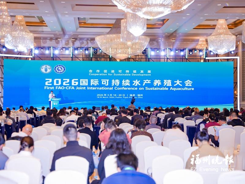 福州深远海养殖牧场。杨柳州 摄 耕海牧渔 渔业产值全国第一 3月18日,由中国渔业协会(CFA)与联合国粮食及农业组织(FAO)联合主办的2026国际可持续水产养殖大会,在福州市开幕。来自中国、南非、墨西哥、澳大利亚、泰国、马来西亚、智利、挪威等全球40余个国家的政府代表、科研专家、企业代表及专业投资机构人士出席此次大会。 据悉,本次大会为期三天,精心设置8大核心议题与1条精品产业考察线路,以“合作促进可持续发展”为核心主题,紧扣全球水产行业发展趋势,搭建起跨国界、跨领域、跨行业的高端交流平台,通过主旨研讨、专题交流、产业实地考察等多元形式,共同探索水产产业绿色转型与创新发展路径,推动《可持续水产养殖业准则》(GSA)落地实施。 主办方表示,本次大会既是展示中国水产养殖“中国智慧”与“中国方案”的重要窗口,也是中外政产学研交流对接的重要平台,助力中国水产养殖与国际接轨,为全球粮食体系转型和蓝色经济高质量发展贡献中国力量。 国际可持续水产养殖大会何以在福州举行呢?记者从会上了解到,2025年中国水产养殖产量超过6300万吨,约占全球的56%,是世界最大的水产养殖生产国,更是创造了3.4万亿元的渔业经济总产值,同时带动数千万人实现就业增收。2025年福建省海洋生产总值突破1.3万亿元、水产品总产量超960万吨,处于全国领先水平;海水养殖产量、人均占有量等多项关键指标稳居全国第一。 记者也从海渔部门获悉,2025年,福州渔业交出亮眼答卷:全市海洋生产总值稳居全国前列;水产品产量达331.3万吨,位居全国第二;渔业产值702.1亿元,位居全国第一;“深远海陆海接力养殖技术”被认定为2025年农业农村部农业主推技术;福州(连江)国家远洋渔业基地投用……至此,福州渔业生产总值连续31年全国第一。这为全球水产业可持续发展提供了“福州经验”和“福州实践”。