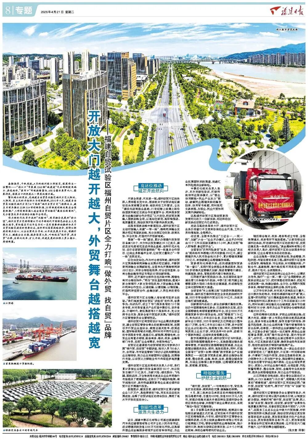 ▲4月21日,《福建日报》8版“专题”刊发《开放大门越开越大,外贸舞台越搭越宽——福建自贸试验区福州自贸片区全力打响“做外贸 找自贸”品牌》。 春潮拍岸,千帆竞渡。4月的福州港江阴港区,滚装作业一派繁忙——“桂江口”号装载1268辆“福建造”汽车刚刚驶离码头、奔赴南非,“黄河口”号便接续靠泊,608台整车鱼贯而入、整装待发,滚装出口的热度从一季度延续不减。
